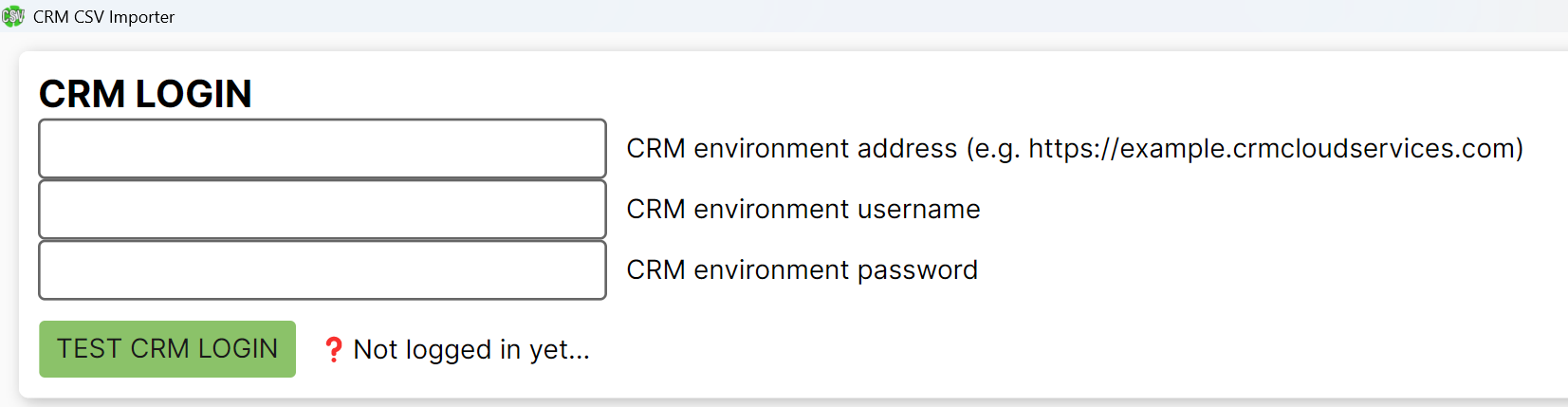 - Avaa CSV Importer ja kirjaudu sisään CRM‑ympäristöön.
