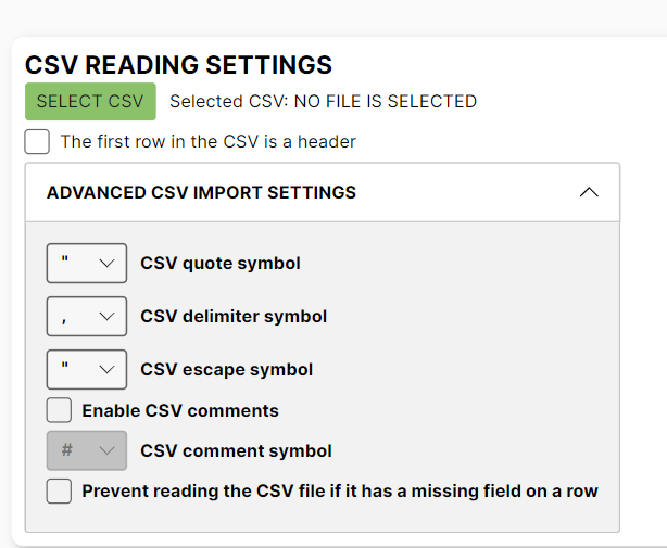 Valitse SELECT CSV ja poimi tiedosto koneeltasi. Kun CSV on valittu:
