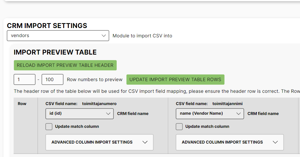 Valitse moduuli, johon CSV aiotaan tuoda. Kun moduuli on valittu, Reload import preview table header ja Update Import preview table rows tulevat käyttöön.