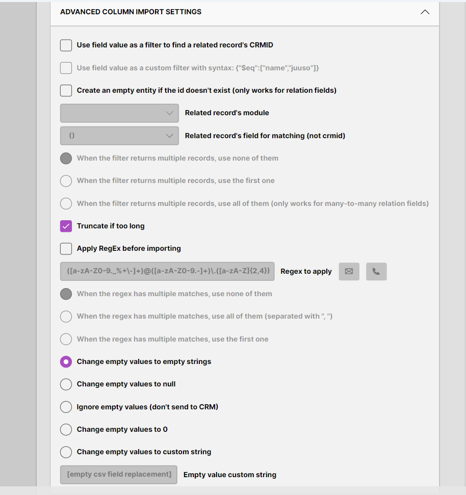 Advanced column settings -osiossa määritellään, miten yksittäisen sarakkeen arvoa käsitellään ennen sen tallentamista CRM:ään.