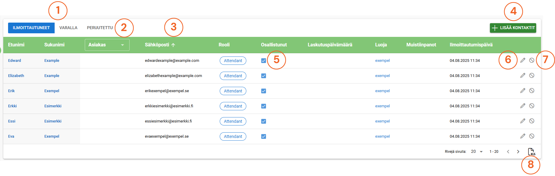 Kaikki ilmoittautumiset listataan Ilmoittautuneet-välilehdelle. Näkymä näyttää kaikki tapahtumaan ilmoittautuneet, mutta lista voidaan myös suodattaa näyttämään vain alatapahtumiin ilmoittautuneet. Myös peruutukset ja varapaikkajono löytyvät tältä välilehdeltä. Yhteystiedot päivitetään automaattisesti tänne käyttäjien ilmoittautuessa kyselyn tai yksilöidyn integraation kautta. Myös yhteystietojen manuaalinen lisääminen on mahdollista ja tällöin kysytään samat kysymykset, jotka kontaktin tulisi täyttää kyselyyn ilmoittautumisen yhteydessä.