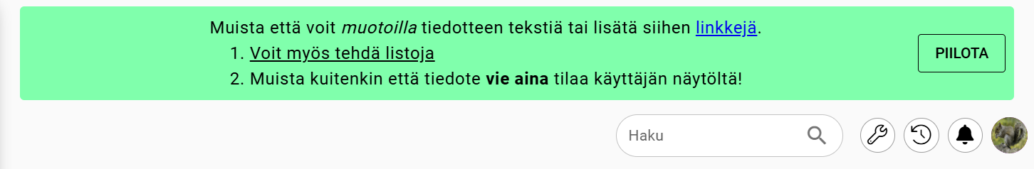 Huomioi, että tiedote vie aina osan käyttäjän näytöstä. Mitä enemmän tiedotteessa on tekstiä, sitä vähemmän käyttäjän näytölle jää työtilaa. Tämä kannattaa siis ottaa huomioon tiedotteiden suunnittelussa ja hyödyntää mahdollisuutta linkkeihin tekstin lyhentämiseksi. Tällä hetkellä järjestelmässä on mahdollista asettaa tiedote piilotettavaksi, joten tätä vaihtoehtoa voidaan myös hyödyntää suurten tiedotteiden kohdalla. Käytettävyyteen on myös tulossa parannuksia tulevissa päivityksissä.