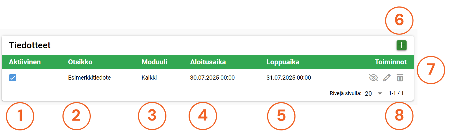 - Toiminnot – Toiminnot-painikkeilla tiedotetta voidaan esikatsella (silmä), sitä voidaan muokata (kynä) ja se voidaan poistaa (roskakori).