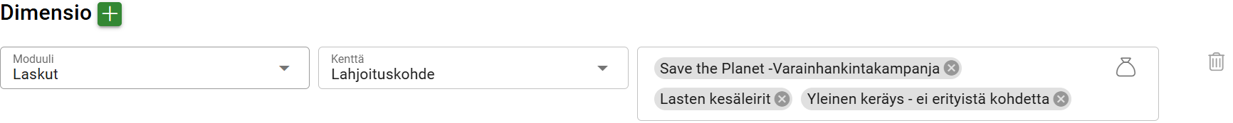 However, we want more detailed information on how the payments are distributed among the desired donation campaigns. For this purpose, the example system has a field called Donation target in the Invoices module. We therefore make the following dimension settings: