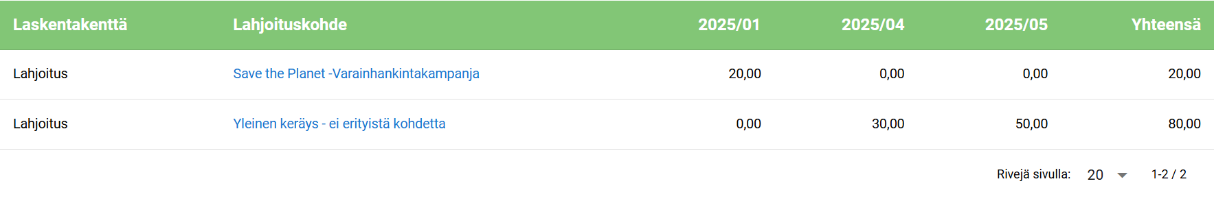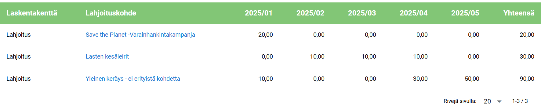 As you can see in the picture above, when viewing grid views, it is good to note that completely empty columns and rows are not displayed. For example, there were no external donations for Children’s Summer Camps in 2025, so this dimension row has been removed from the view. In addition, there were no external donations in February-March, so the April column 2025/04 is displayed after the January column 2025/01.