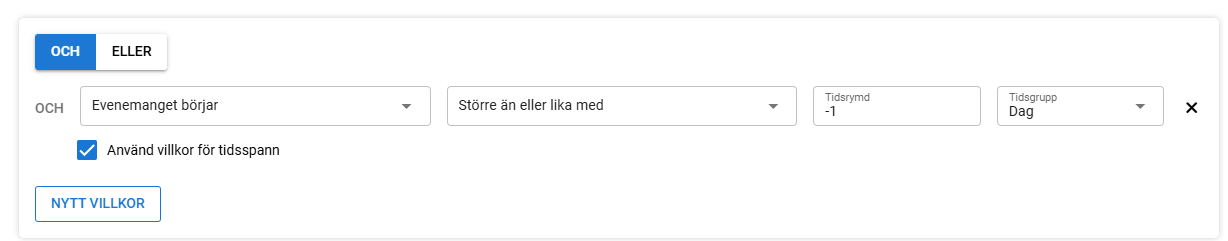 - Villkor: Evenemang startar – Använd tidsintervallvillkor – Större än eller lika med – -1 dag