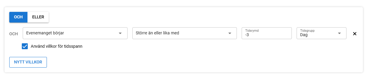 Evenemanget börjar – Använd villkor för tidsspann – Större än eller lika med – -3 dag